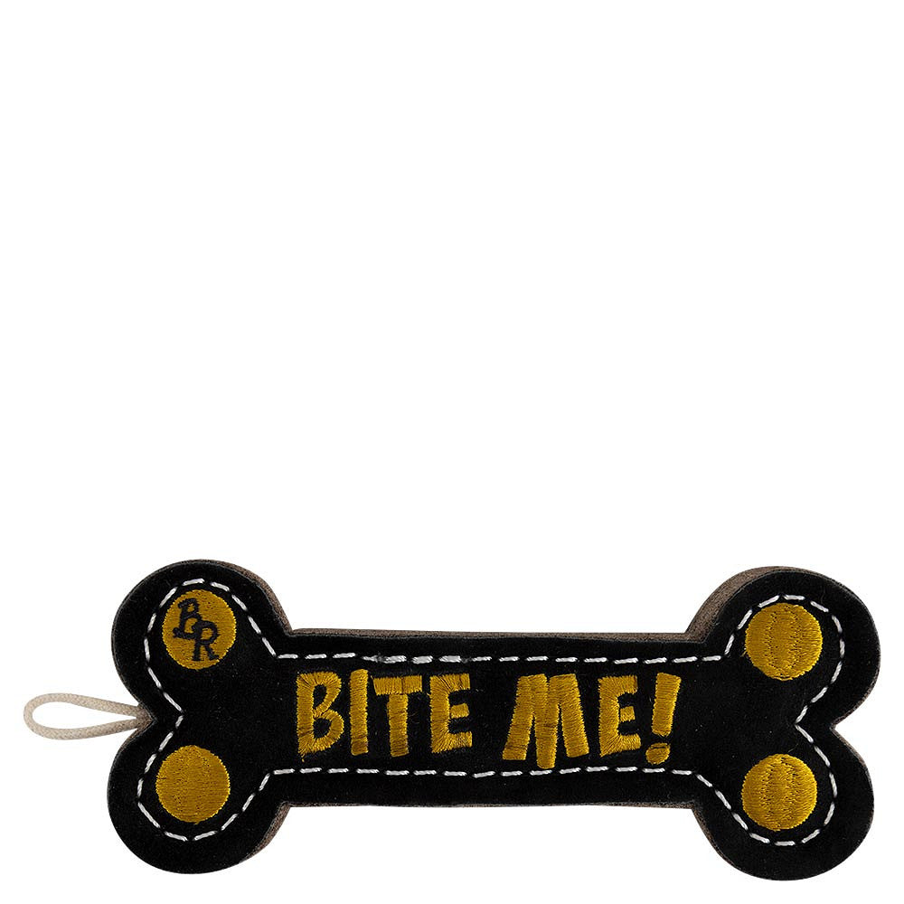 Dit schattige hondenspeeltje heeft een harde binnenkant en zachte buitenkant. Met dit speeltje kan je hond naar hartenlust spelen zonder dat het makkelijk scheurt of kapotgaat. Het speeltje is geborduurd met het BR-logo en de tekst “Bite me!”.