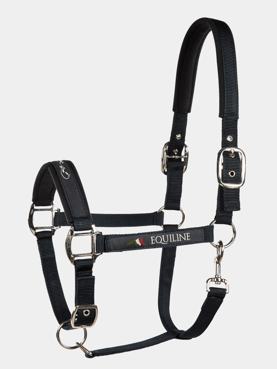 Equiline Halster Timmy dubbel verstelbaar polypropyleen halster van Equiline. Met sterke metalen bevestigingen. Het halster is voorzien van een zachte neopreen voering en een mooie borduring op de neus.