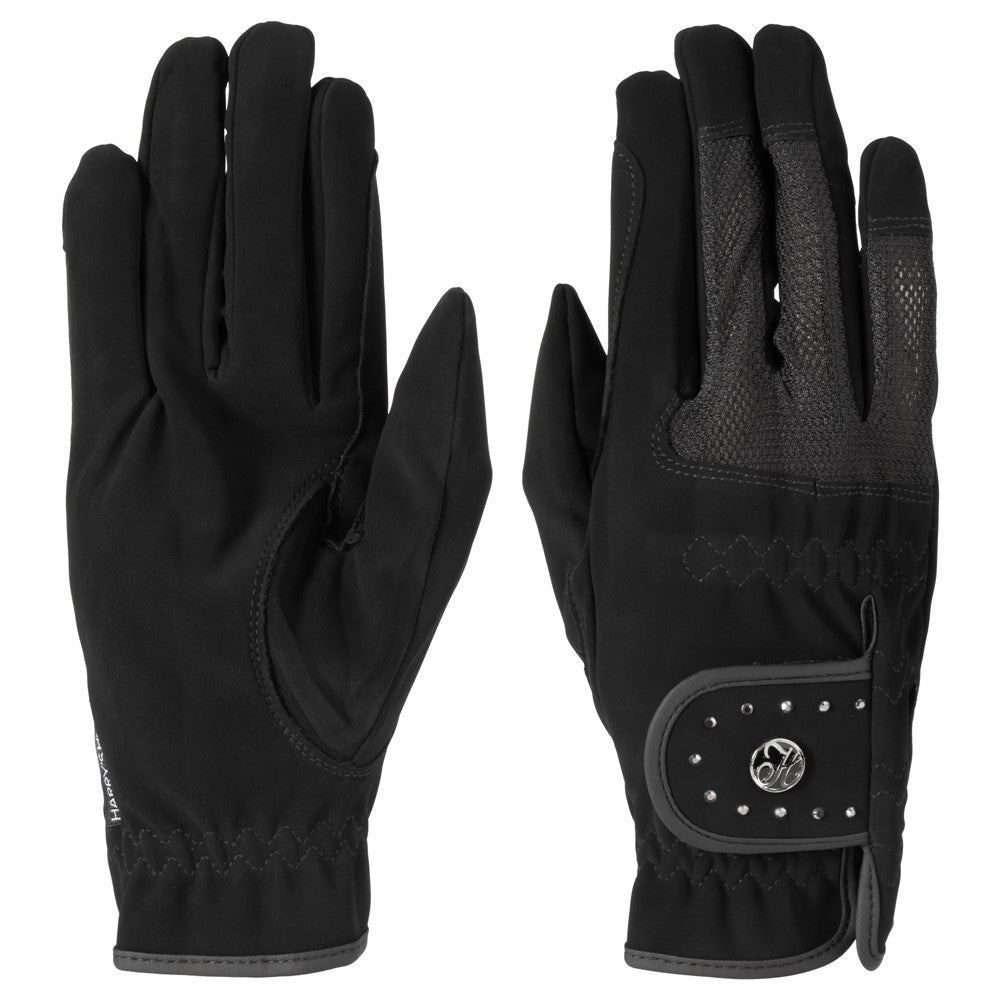 Luxuriöse Domy Suede-Handschuhe mit elastischen Einsätzen an beweglichen Teilen für optimale Bewegungsfreiheit. Die elegante Manschette mit Klettverschluss ist mit funkelnden Kristallen verziert und verleiht so einen raffinierten Look.
