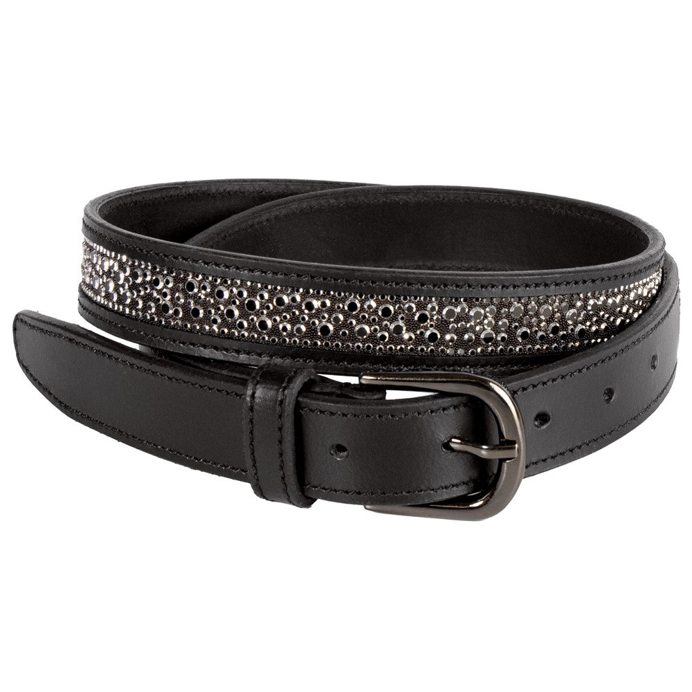 Luxuriöser Ledergürtel, aufwendig verarbeitet mit funkelnden runden Kristallen.