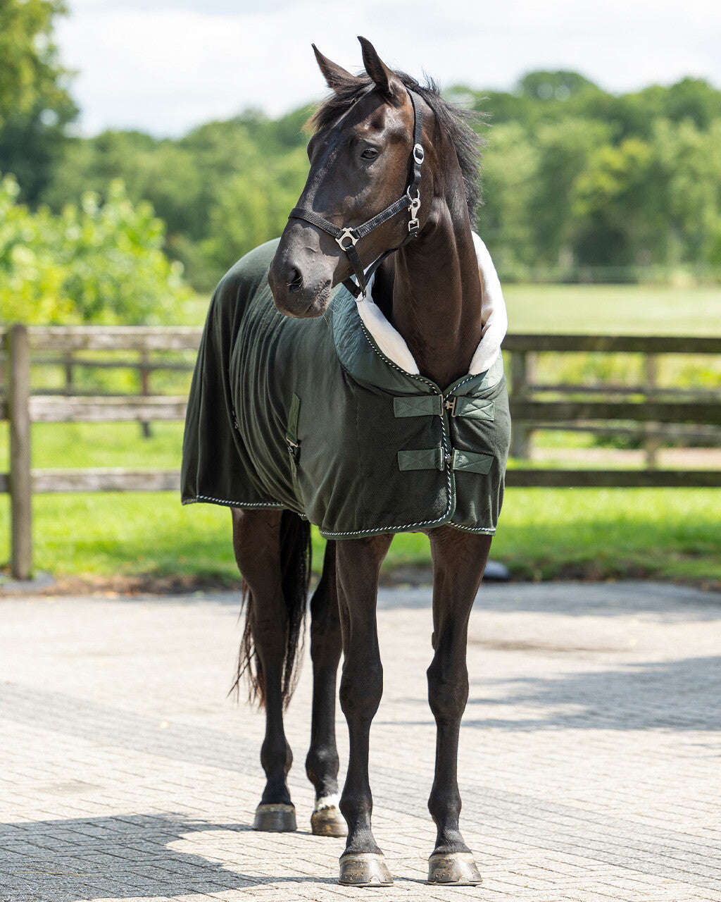 Laat jouw paard stralen met deze zeer elegante showdeken met een kraag van satijn en imitatiewol. De zweetdeken is gemaakt van extra zachte fleece voor extra comfort. Het tweekleurig sierkoord maakt de deken helemaal af.