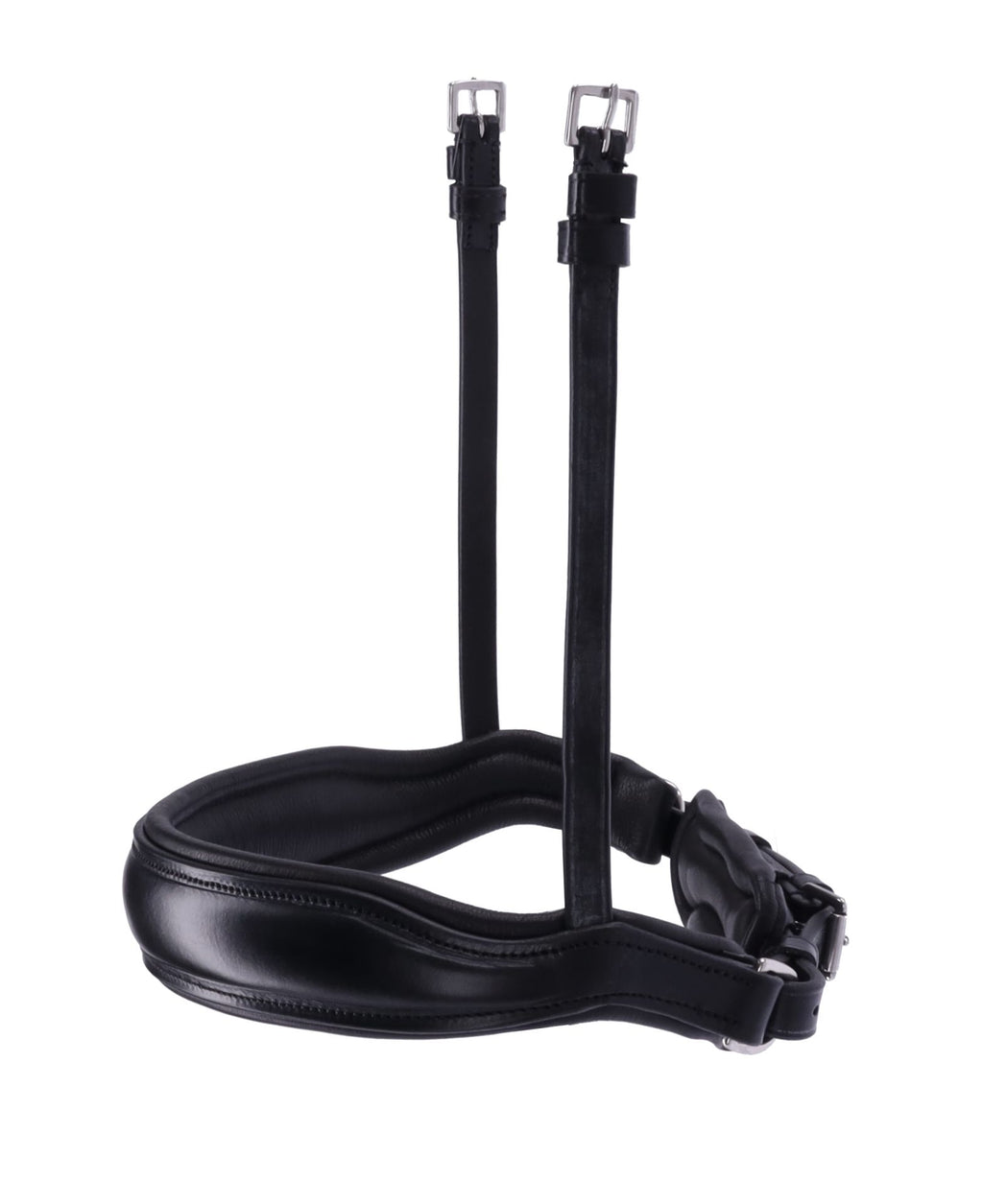 Engelse neusriem met zilverkleurige fournituren. De bevestiging is middels een aansnoerneusriem.