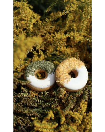 Set van 2 paardensnoepjes donuts met glazuur en kruiden.Twee handgemaakte paardendonuts met Peterselie en Calendula: kleurrijk, natuurlijk en boordevol gezondheidsvoordelen.
