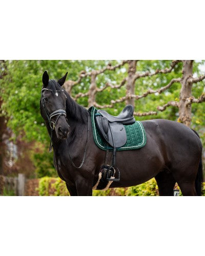 HB Showtime anatomisch zadeldek VelvetAnatomisch zadel dek velvet heeft een mooie pasvorm onder het zadel.Binnenzijde van dit dek is gevoerd met Cool Max voering. Dit voor eenbetere vochtopname en warmte regulerend.