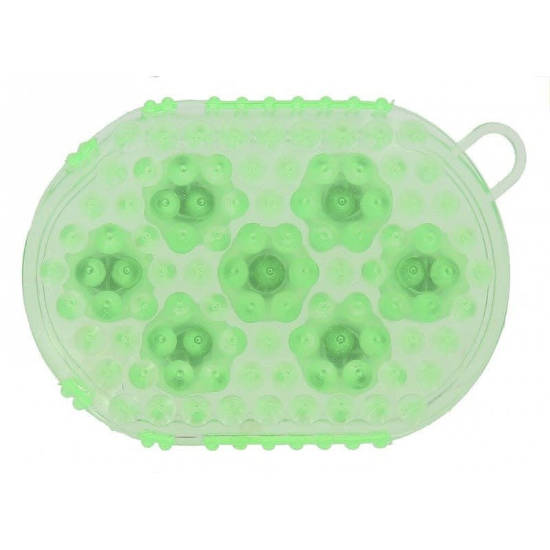 Dubbel functionele pvc handschoen. De ene kant is een rosborstel en de andere kant heeft rvs rond draaiende balletjes. Helpt bij de warming up van de spieren van uw paard voor de training en ontspant de spieren erna.