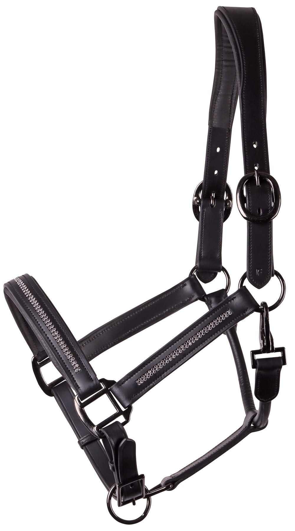 Luxe lederen halster gedecoreerd met kristallen op de neusriem en op de kaken. Extra soepel en zacht onderlegd en aan beide zijden van het kopstuk verstelbaar.