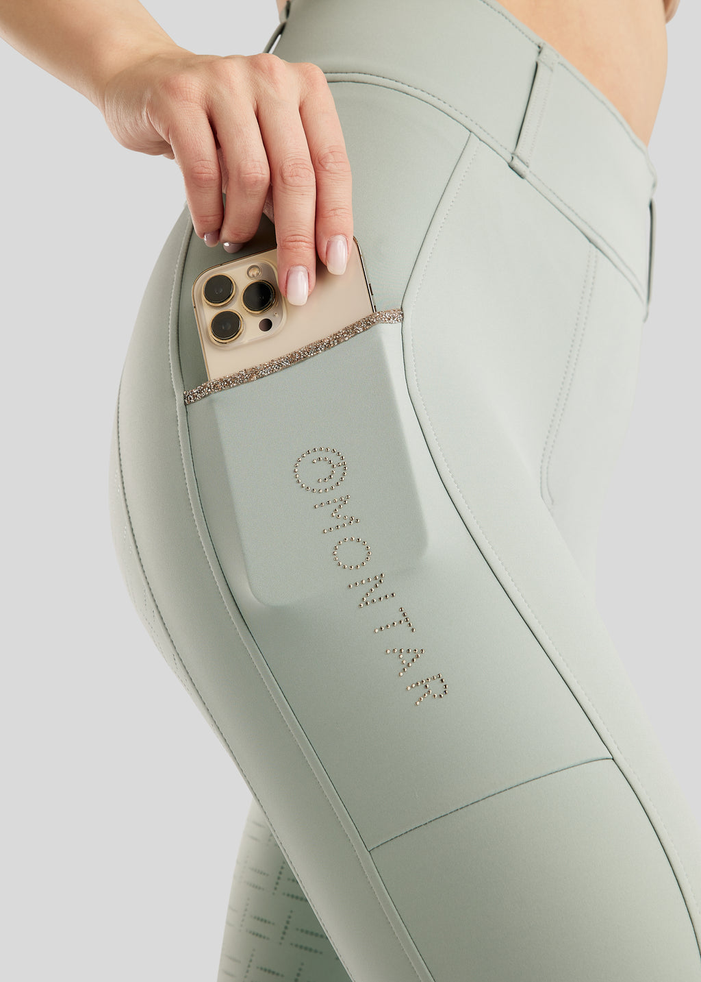 De MoLila pull-on rijbroek heeft twee telefoonzakjes, elk versierd met een prachtig champagnekleurig kristallen bandje aan de bovenkant. Op één zakje staat het woord Montar, gevolgd door een logo van kleine champagnekleurige kristallen. Dit geeft een verfijnde en exclusieve touch.